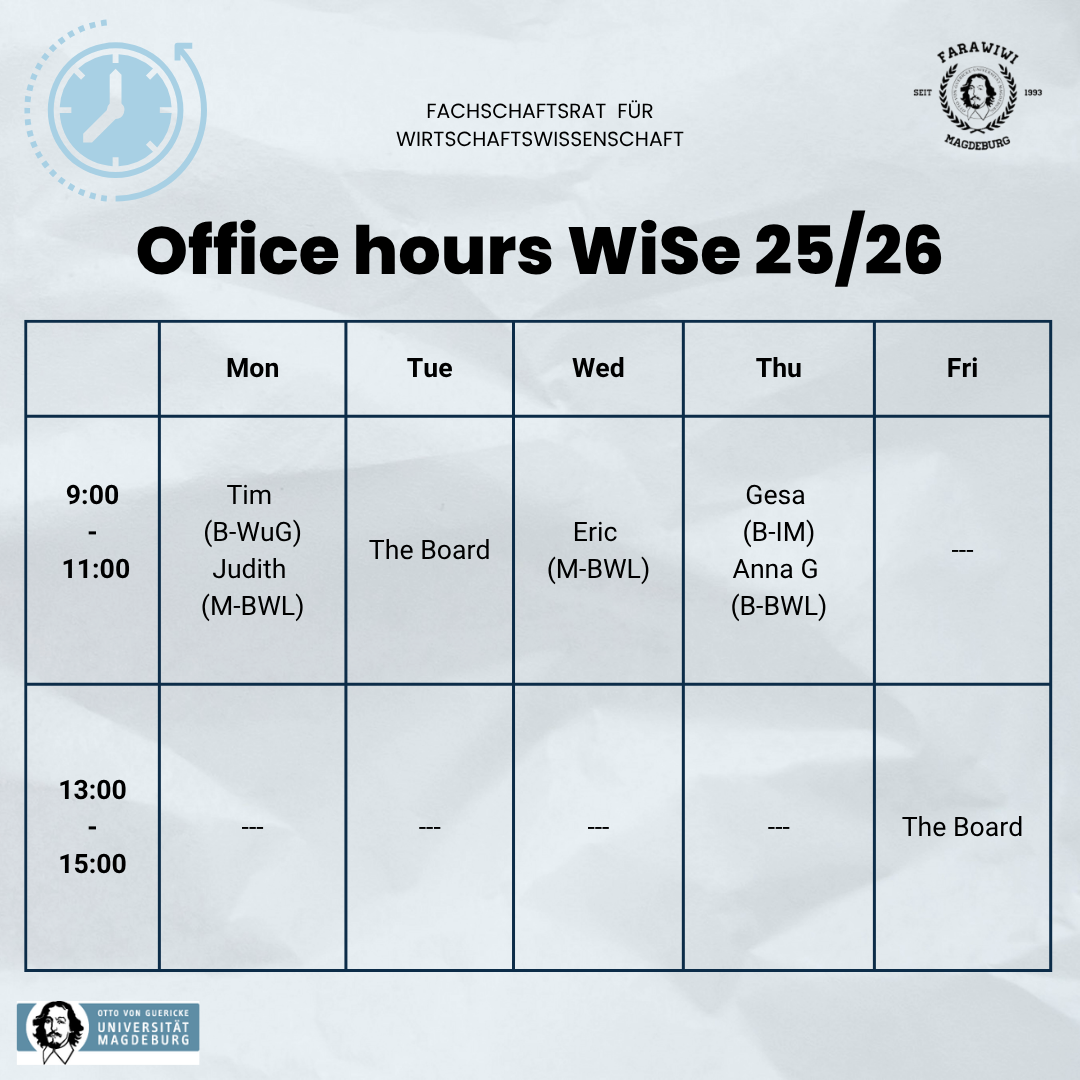 Wir stehen dir gerne bei Fragen und Problemen rund um dein Studium zur Verfügung. Komm einfach während unserer Sprechstunden in unserem Büro vorbei!